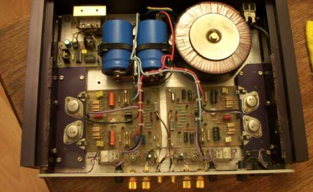 L’ampli de puissance est le « mini crescendo » d’écrit dans la revue Elector. L’implantation est réalisée différemment, l’ensemble repose sur une plaque en alu. Les radiateurs sont récupérés sur de vieux télécopieurs et le capot est découpé dans un ancien capot de central téléphonique. Le préampli à tube est une réalisation personnelle. Il a un réglage baxandall (grave et aigu), une entrée phono. La haute tension est temporisée ainsi que la sortie de façon qu’il soit connecté à l’ampli de puissance une fois stabilisé.